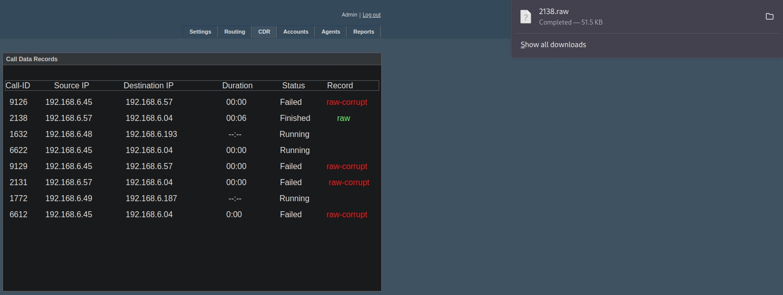 We can view the CDR (Call Data Records) and find that one of them is raw, which allows us to download it:
