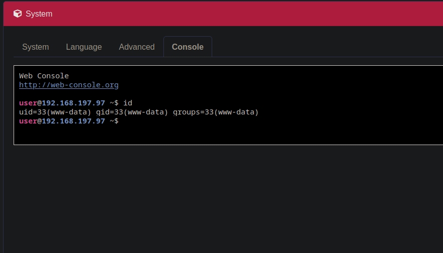 ----------------------------------------------------------- ---------------------------------However, we don't actually need any exploits because within the 'System' tab, there's a Console present: