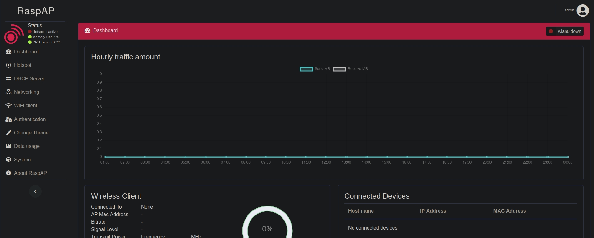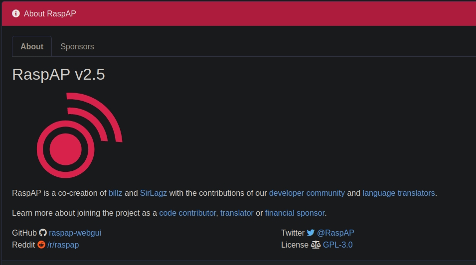 This is running RaspAP, which is a wireless router software. We can find the version by heading to 'About RaspAP':