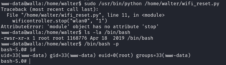 wificotroller.start("wlan0", "1")This is pretty easy to exploit. We can create a script wificontroller.py and place it within the /home/walter directory. Here's the contents of it:
