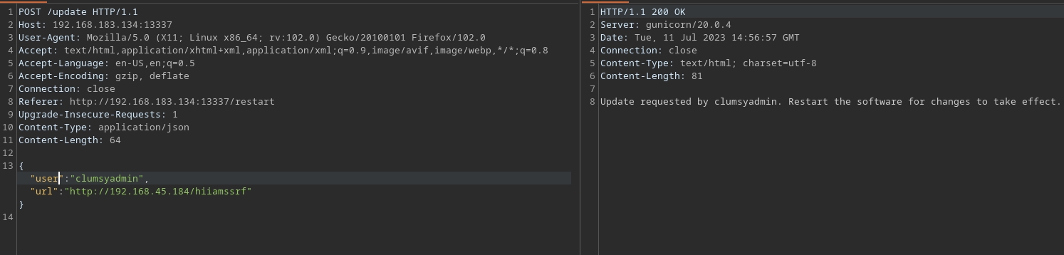 clumsyadmin:x:1000:1000::/home/clumsyadmin:/bin/shThere's a clumsyadmin user present, and this might be the user we need. Then, we can use the /update endpoint to send requests to our HTTP server:
