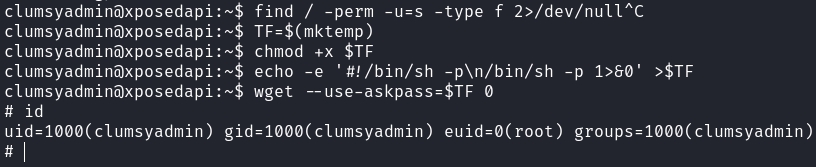 clumsyadmin@xposedapi:~$ find / -perm -u=s -type f 2>/dev/null