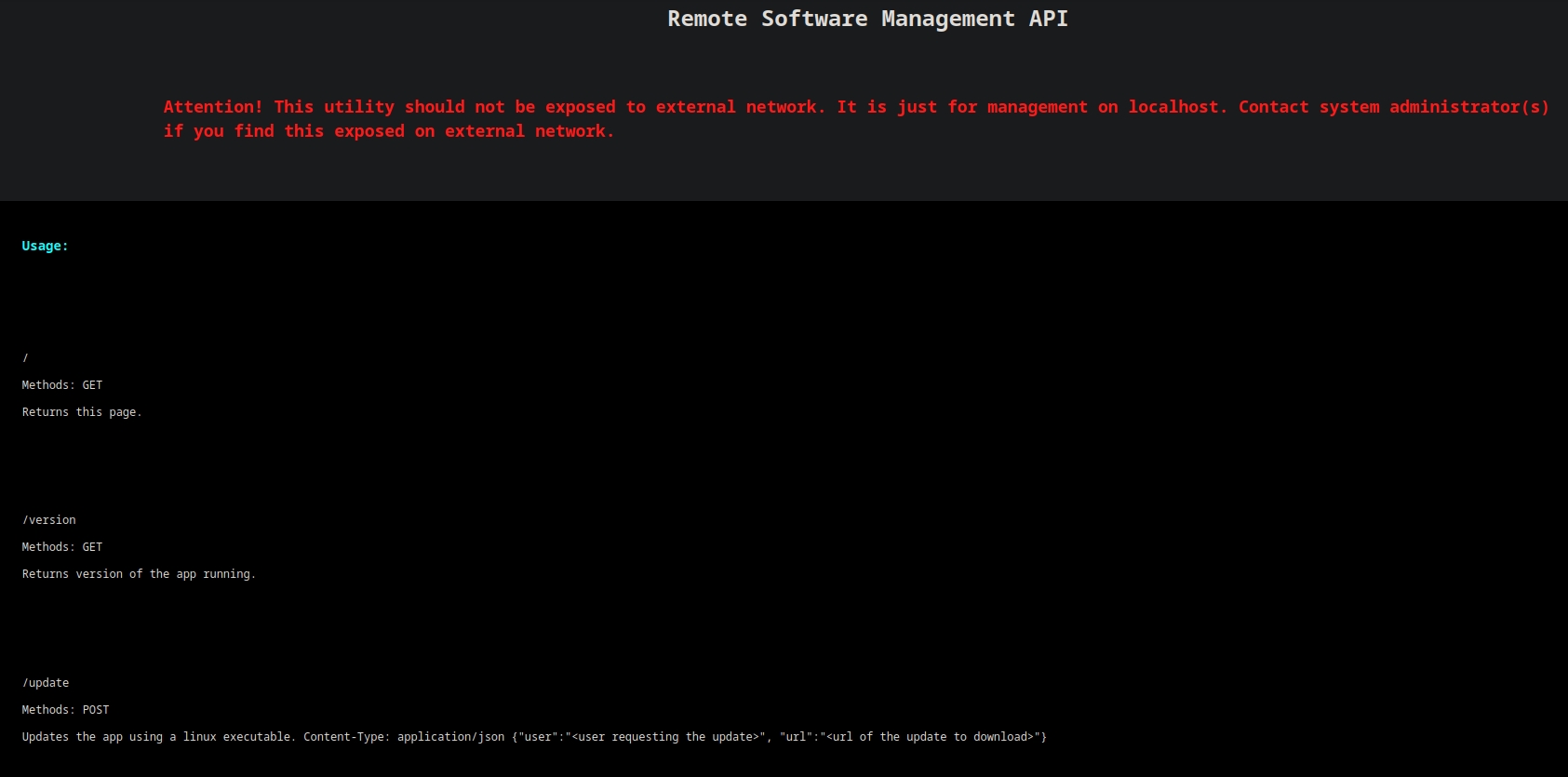The most interesting was the /update endpoint, which accepted a user-controlled URL and says it updates the application via a 'Linux Executable'. This might be vulnerable to RCE if we can chain commands to the end of the URL.