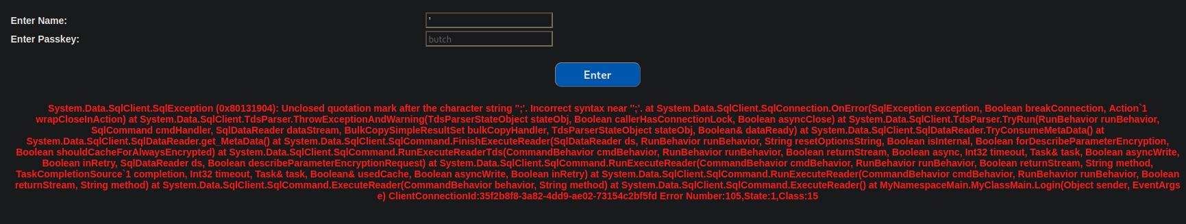 Default credentials don't work. Attempting any form of SQL Injection shows this: