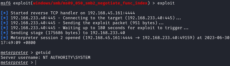 |_smb-vuln-ms10-061: Could not negotiate a connection:SMB: Failed to receive bytes: TIMEOUTThis is vulnerable to CVE-2009-3103. I ran the Metasploit module to exploit this (because I was honestly lazy since I'm re-doing the machines for the writeups) after resetting the machine since the nmap scan apparently crashed it.