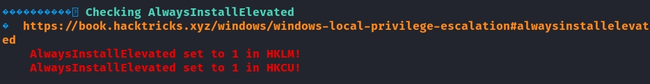 I ran winPEAS.exe to enumerate the machine for me. It picked up on AlwaysInstallElevated being misconfigured: